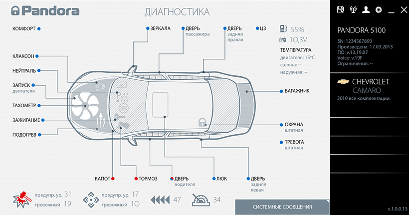 К функционалу Pandora Alarm Studio относится также возможность дистанционного контроля параметров работы сигнализаций Pandora — благодаря фирменному интерфейсу на 2,4 ГГц можно быстро проверить функционал системы как по цифровой шине авто, так и по аналоговым входам.