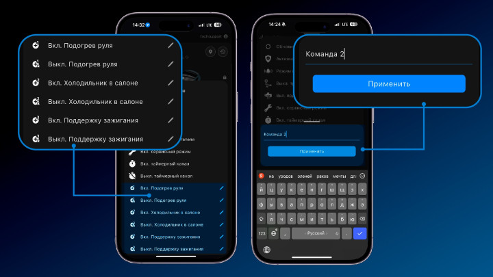 Кроме того, система позволяет отправлять до трёх дополнительных команд, включая поддержку зажигания. Названия команд можно легко изменить под собственные нужды.