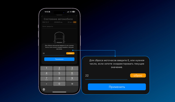На вкладке расширенного состояния теперь отображаются давление в шинах, пробег, положение стекол и уровень омывающей жидкости. Также реализован точный подсчёт моточасов, который можно сбросить или откорректировать вручную, например, после замены масла. Моточасы фиксируются только при работающем двигателе — это особенно важно для гибридных моделей.